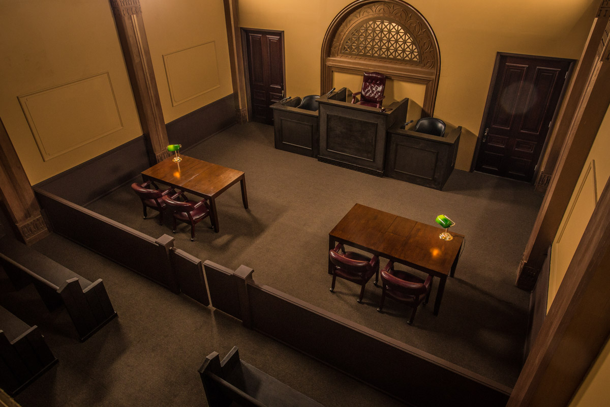 The Courtroom Standing Set includes a full courtroom with Judges Box, Witness Boxes, Audience Area, Plaintiff/Defendant's Desks and a Judges Chamber. Judge and Witnesses Boxes are on wheels and can be moved for greater production flexibility. The dome above the Judge may be lit from behind to give the appearance of a glow. Lots of room and attention to detail. Perfect for small and large film productions.