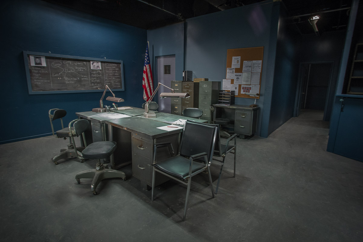 The Bullpen Standing Set includes multiple entrances, hallways, two windows, chalkboard and a collection of desks and chairs.. Props include an American flag, various office supplies, file cabinets, phones and desk lamps. Our Bullpen also features a small equipment room, with space to fit a member of your cast.