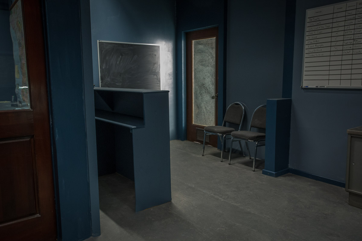 The Waiting Area Standing Set includes the main entrance to our Police Station Standing Set and features a glass door for dramatic lighting opportunities. A reception desk, stool and various wall decoration is also included. The Waiting Area allows for even more room and flexibility for our attached <b>Bullpen Standing Set</b>.